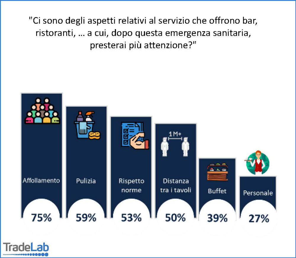 Grafico: priorità degli italiani fuori casa post-emergenza. Affollamento, pulizia, distanze, buffet, personale. Ritorno al ristorante.