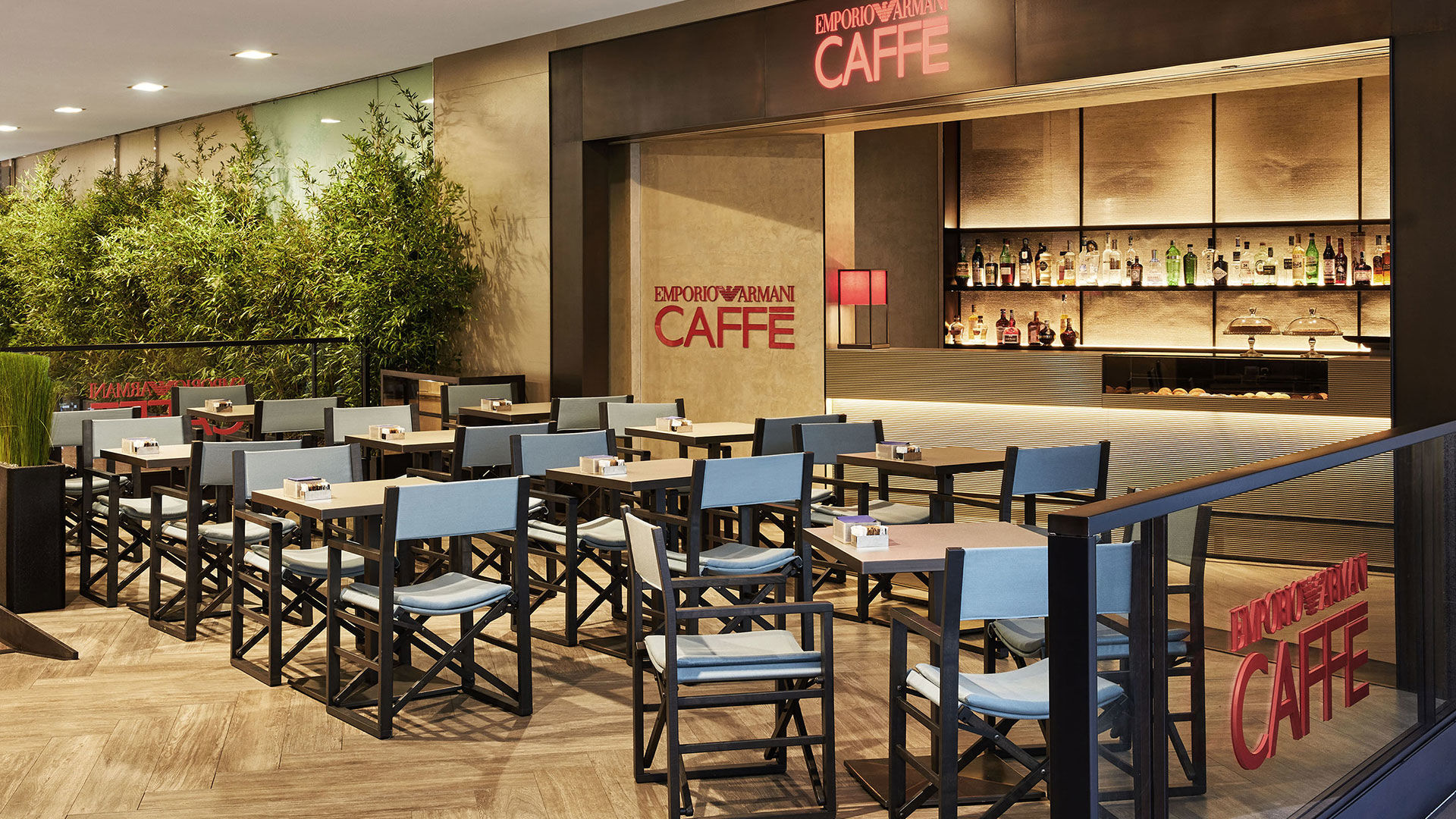 Interni dell’Emporio Armani Caffè a Bologna. Ristorazione e moda Armani.