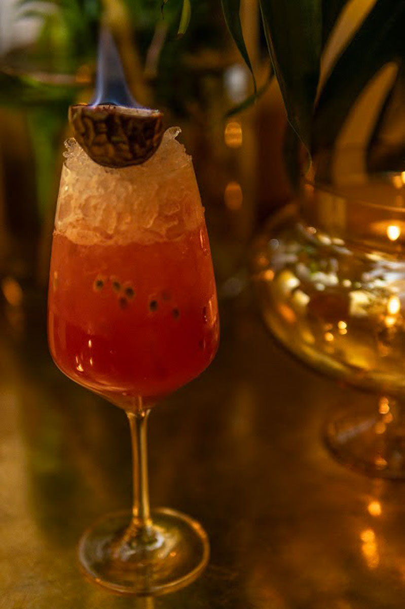 Cocktail Gin Day: drink rosso con ghiaccio e frutto della passione in fiamme. © Riproduzione riservata