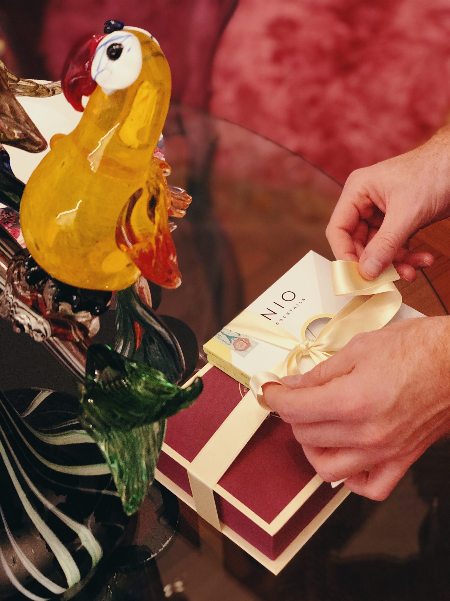 Aperitivo Food Experience: Nio Cocktails confezione regalo con fiocco, accanto pappagallo decorativo. © Riproduzione riservata