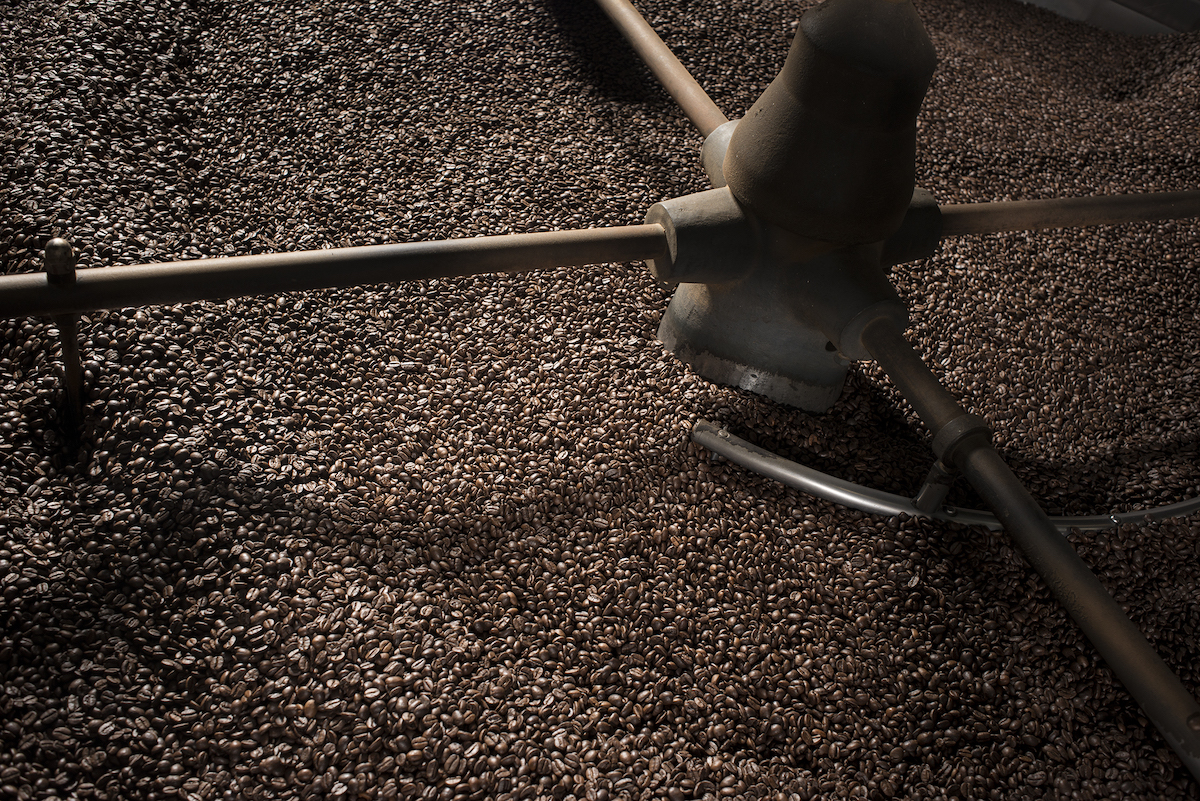 Torrefazione caffè: macchina con chicchi tostati. Impatto guerra Ucraina sul caffè italiano.