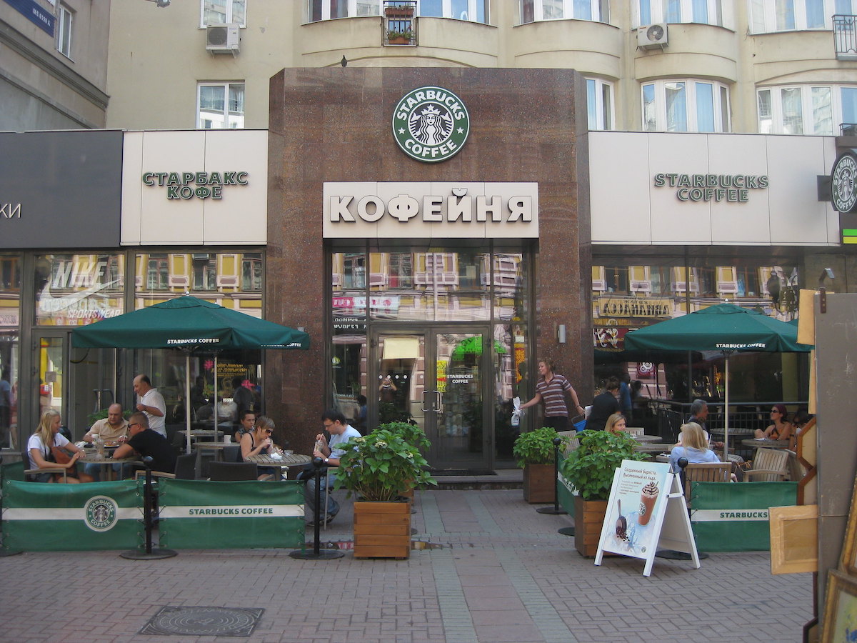 Starbucks a Mosca. Facciata del negozio con insegne in russo e inglese. Persone sedute all’esterno. © Riproduzione riservata