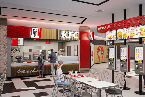 Nuovo ristorante KFC a Roma. Interni moderni, area ordini e tavoli. Pollo fritto e menu KFC. © Riproduzione riservata