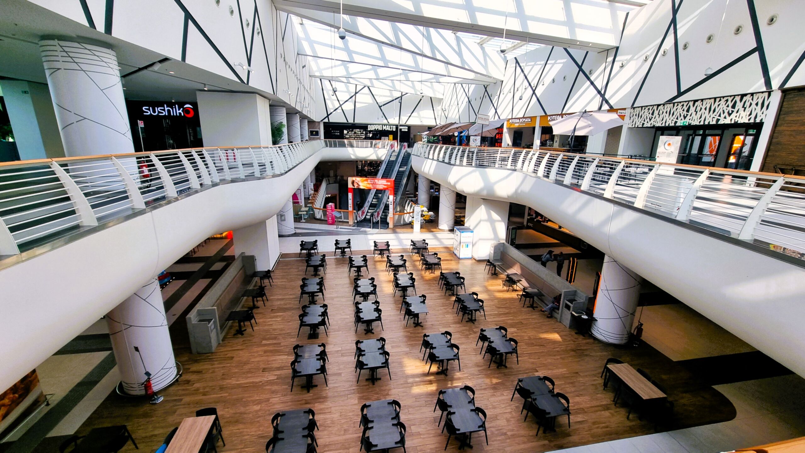 Area food court: tavoli e sedie in un centro commerciale moderno. Ristoranti e design architettonico.