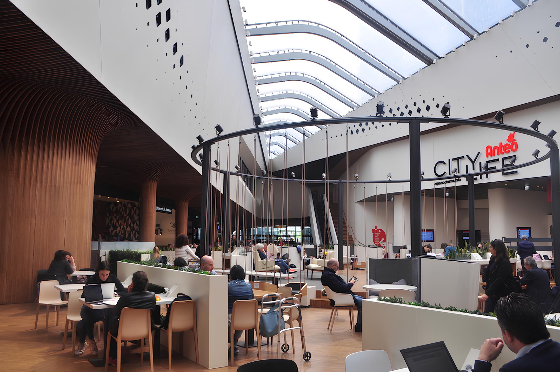 Area ristorazione CityLife, Milano. Persone sedute ai tavoli. Top 30 Food Court.