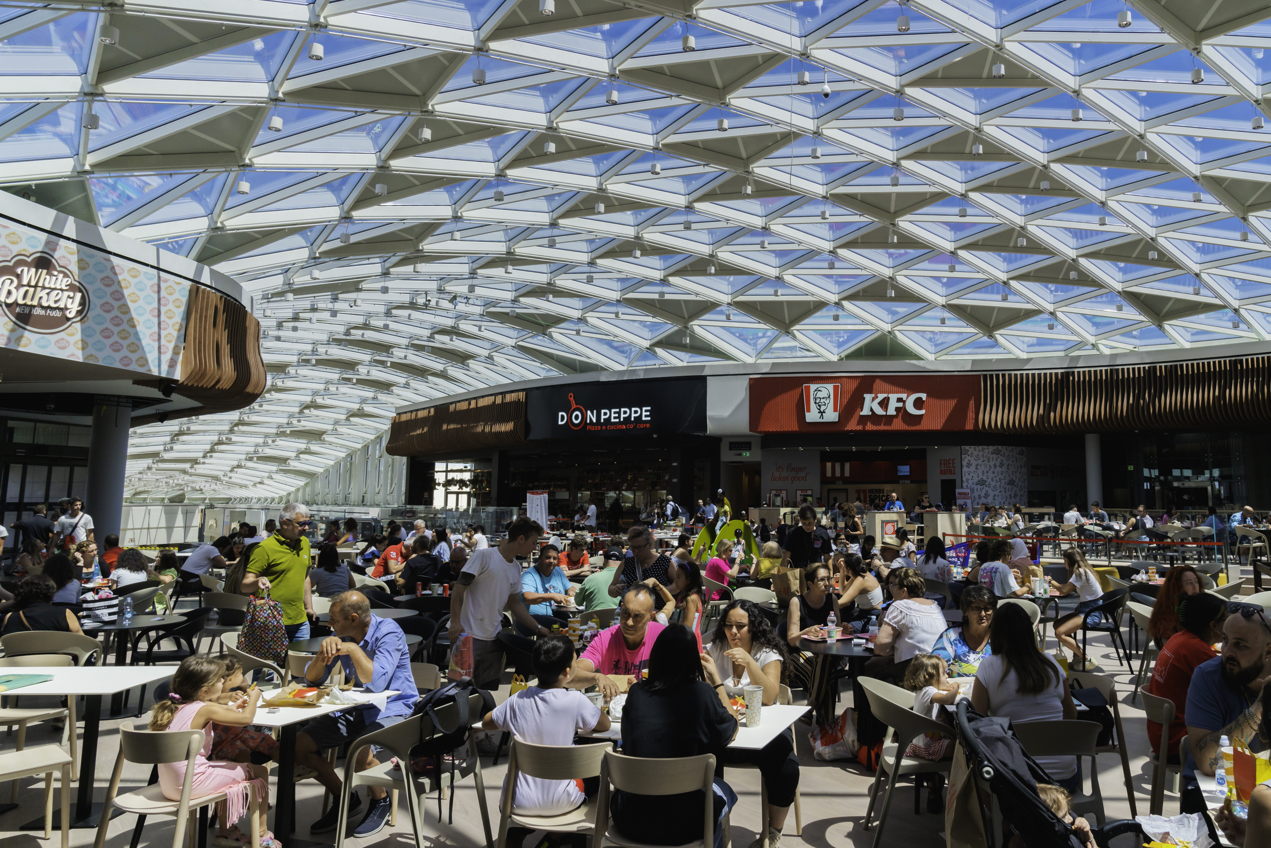 Area ristorazione affollata. Persone ai tavoli, fast food come KFC e Don Peppe.