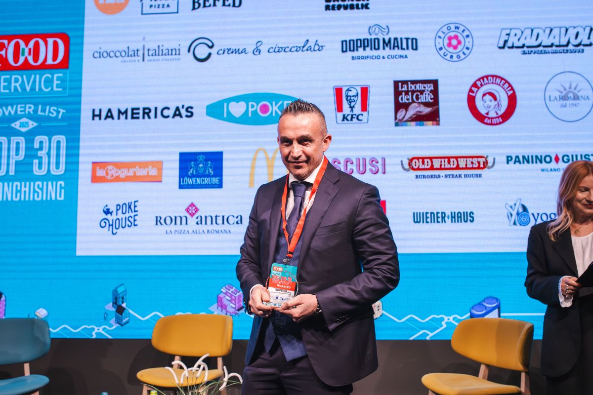 Top 30 Franchising: uomo in giacca e loghi di ristoranti come KFC, Romantica e Old Wild West.