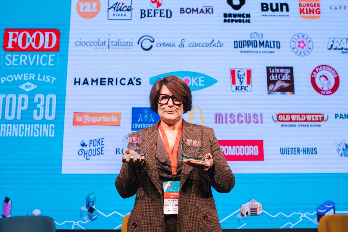 Premiazione top 30 franchising food service. Donna con premi, loghi ristorazione sullo sfondo.