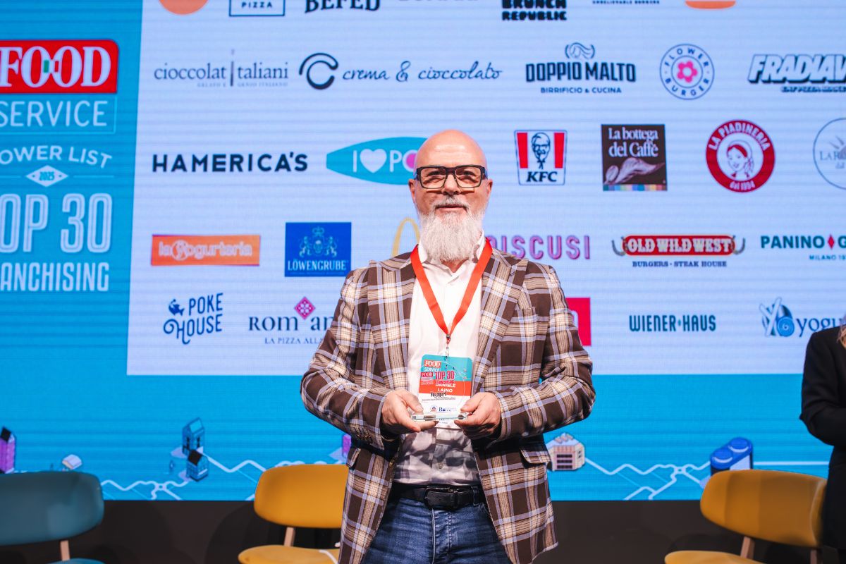 Premiazione Food Service Powerlist Top 30 Franchising. Uomo con premio, loghi ristorazione sullo sfondo.