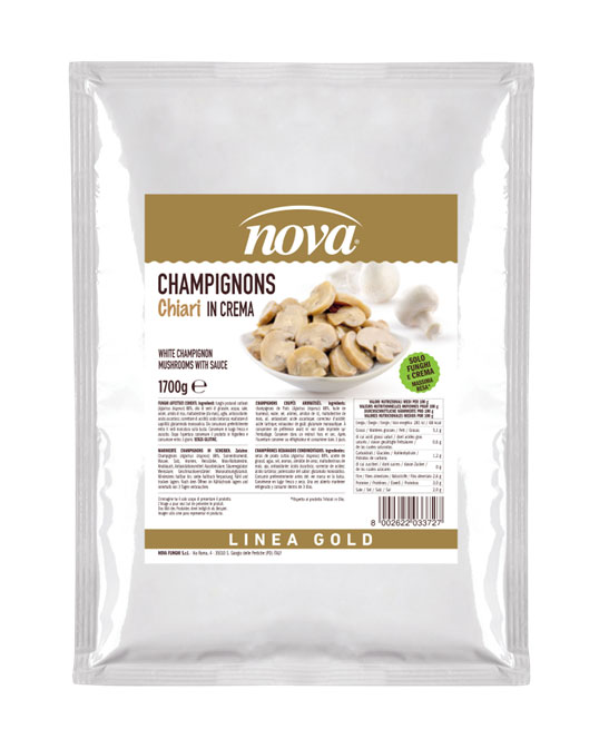 Champignons chiari in crema Nova, funghi champignon affettati in confezione. © Riproduzione riservata
