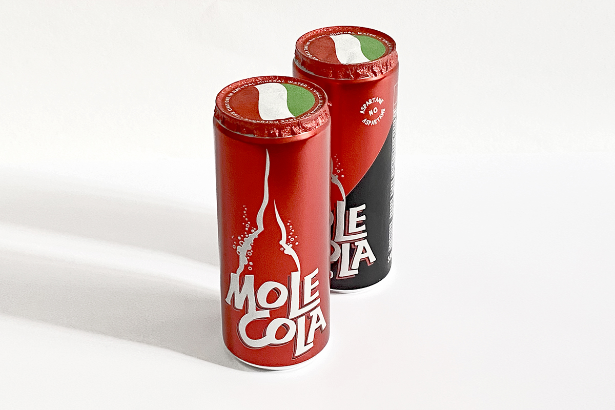 Lattine di MoleCola Classica e Senza Zucchero con tappo tricolore. Bevanda italiana.